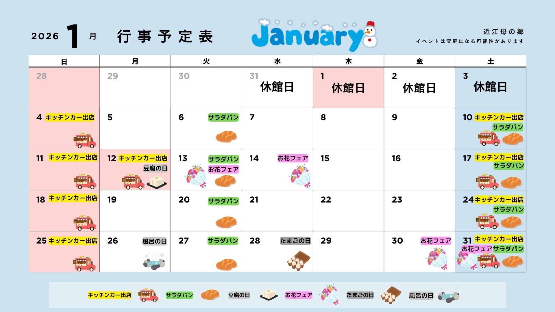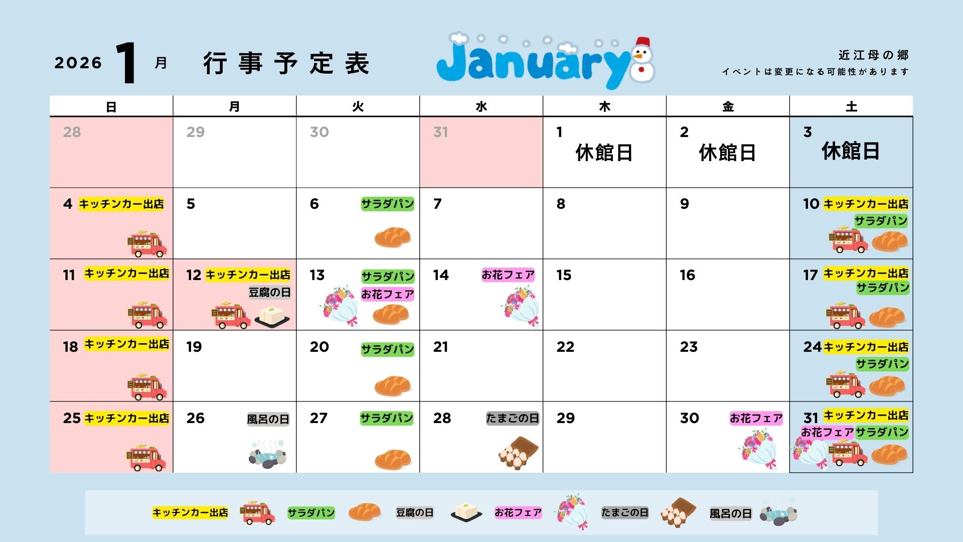 道の駅 近江母の郷「1月のイベント・営業カレンダー」をお知らせいたします。