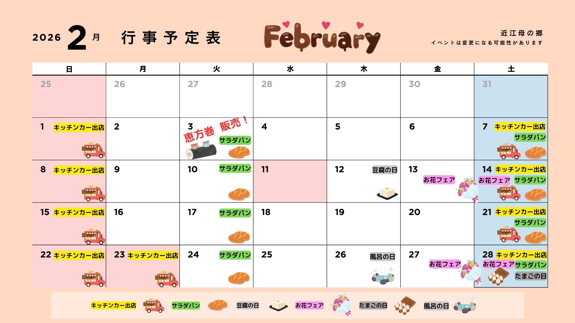 道の駅 近江母の郷「2月のイベント・営業カレンダー」をお知らせいたします。
