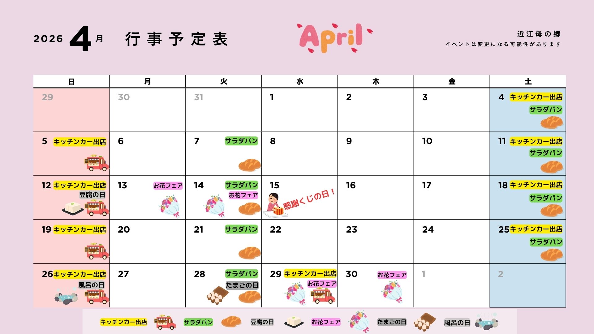 道の駅 近江母の郷「4月のイベント・営業カレンダー」をお知らせいたします。