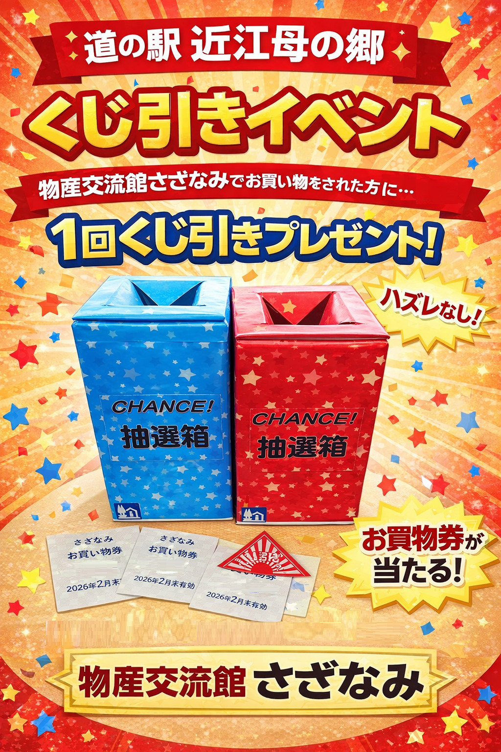近江母の郷では、毎月1回「物産交流館さざなみ」で当日お買い物をされた方全員が参加できる「くじ引きイベント」を開催いたします。
