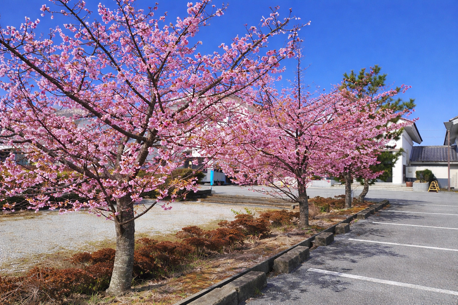 施設周辺の桜の木では、濃いピンク色の花が少しずつ咲き始め、やわらかな春の景色を楽しんでいただけます。河津桜は早咲きの桜として知られ、徐々に花数が増えていきます。